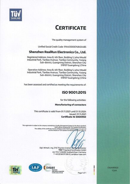 スタンダード:ISO 9001 番号:DA00950 発行日:2021-11-01 有効期限:2024-11-01 範囲/範囲:Manufacturing of connectors で発行:TÜV Saarland Certification (Shanghai) Co., Ltd. |